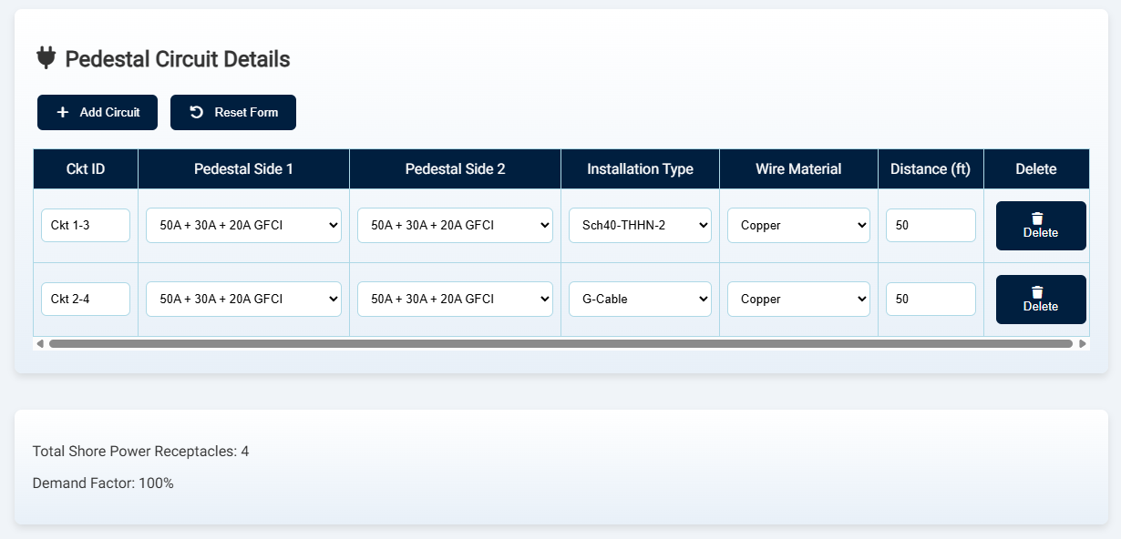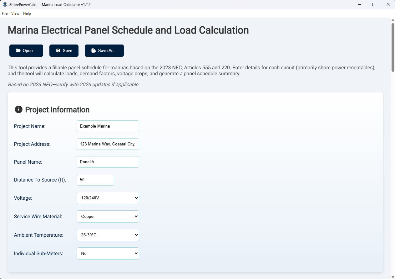 ShorePowerCalc is a Windows‑based marina shore‑power load calculator built around the 2023 National Electrical Code (Articles 555 & 220). It supports 120/240 V single‑phase and 120/208 V three‑phase services, with all pedestal locations currently treated as single‑phase at the selected voltage. The tool automates marina load calculations by generating demand loads, breaker and conductor sizes, panel schedules and one‑line diagrams eliminating guesswork so you can focus on design and compliance.