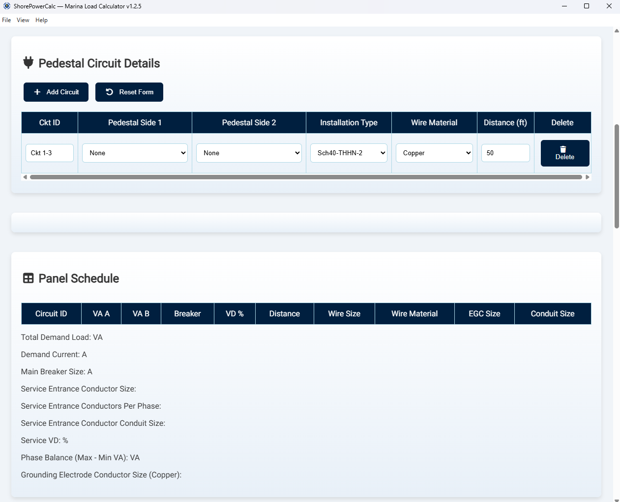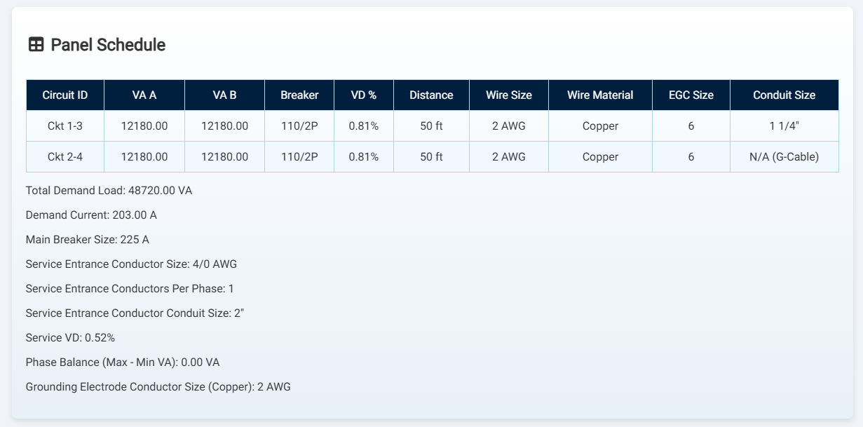 ShorePowerCalc produces detailed panel schedules with circuit IDs, volt‑amps per phase, breaker ratings, voltage drop and wire specifications.